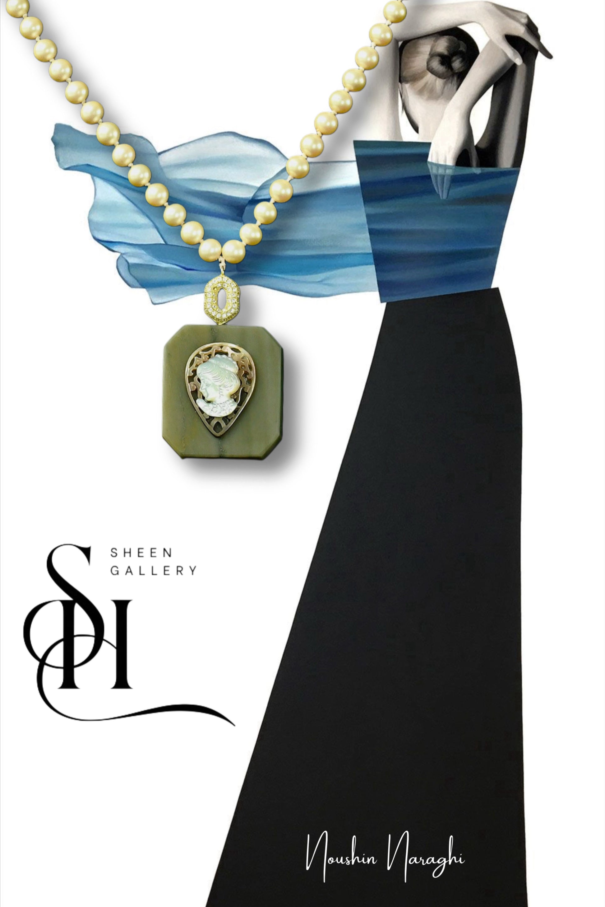 At its center lies a delicate cameo—a carved female portrait on natural shell, symbolizing timeless stillness and presence.
