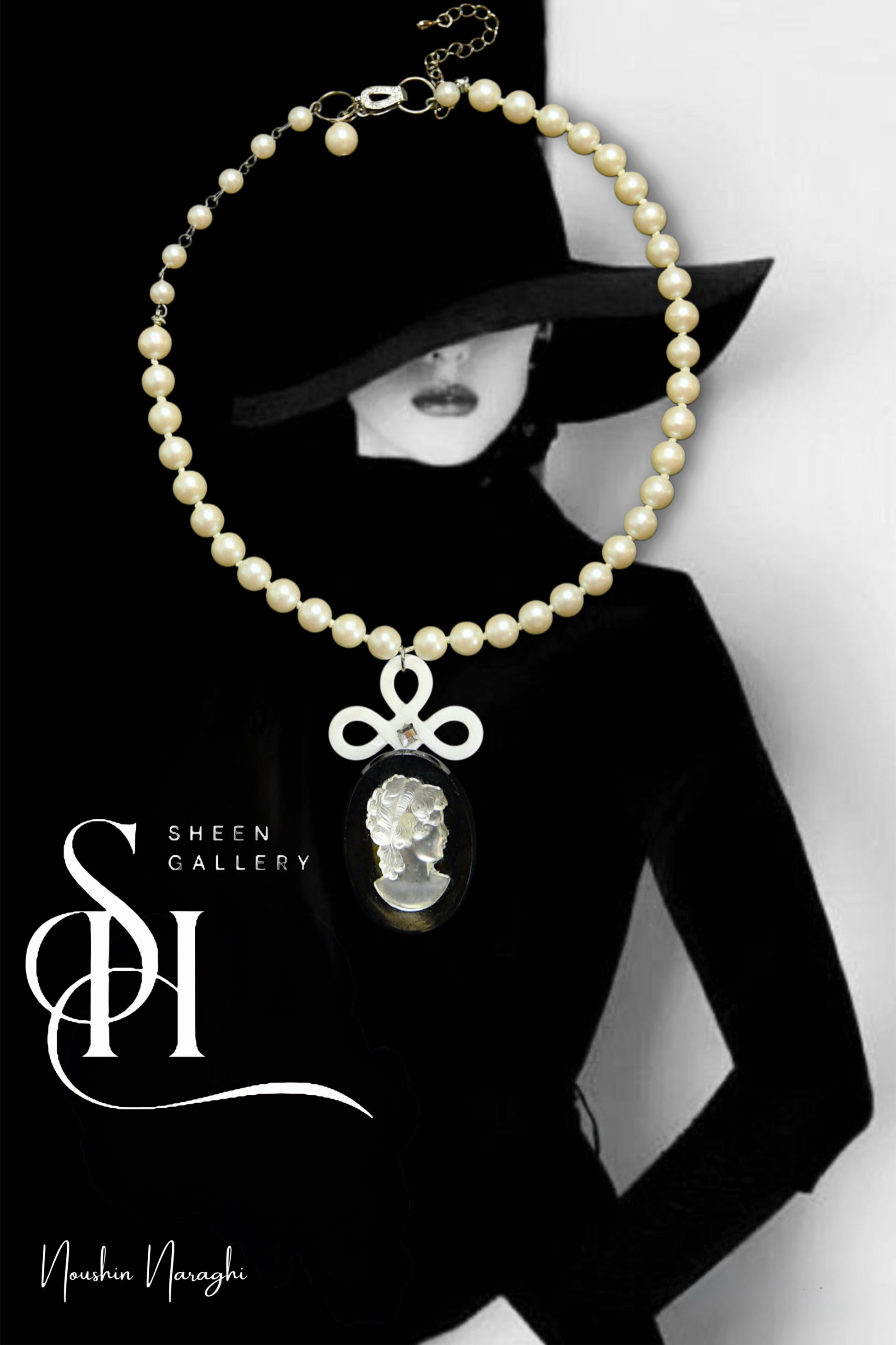 رشتهای از مرواریدهای طبیعی این تصویر جاودانه را در آغوش گرفتهاند،